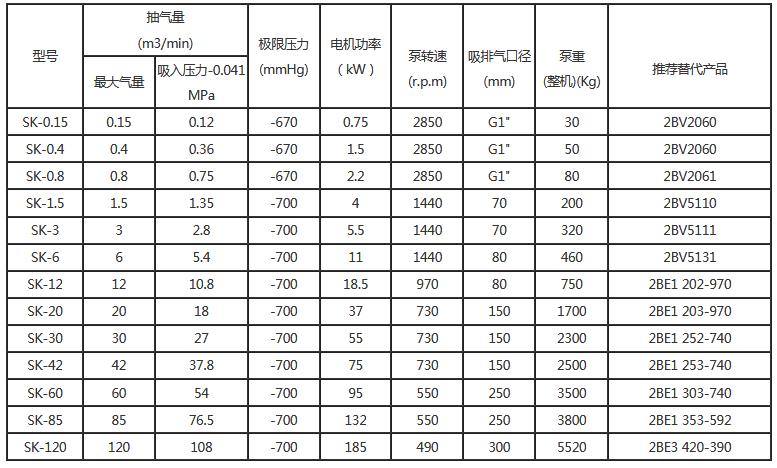 四、SK型水环式真空泵的主要技术参数: